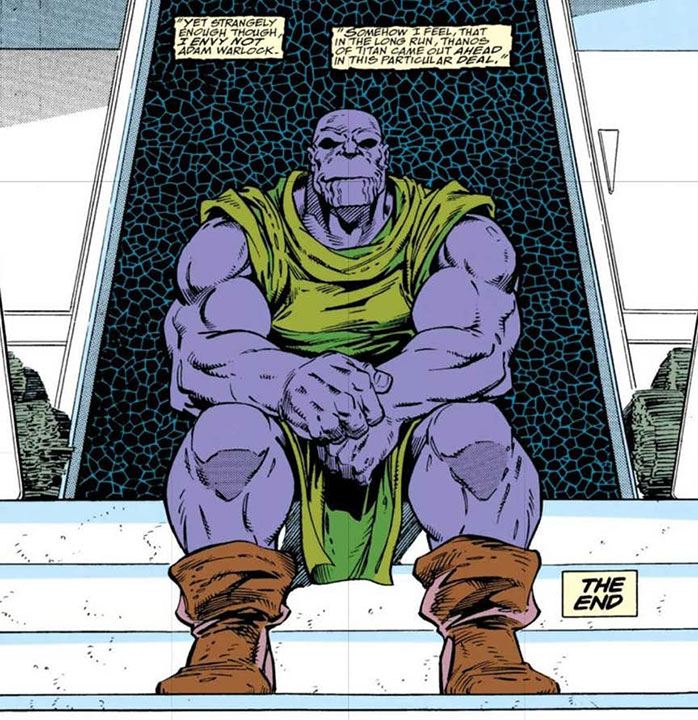 Silver Surfer y Adam Warlock se transportan a sí mismo al Soul World, donde provocan una desarmonía provocándole un gran dolor a Nebula que la obliga a soltar el Guantelete, cuando esta lo suelta, la batalla por ver quien logra obtenerlo no para, pero Adam Warlock logra llegar a tiempo para tomarlo y hacerse cargo de él. Thanos prefiere matarse antes de vivir encarcelado toda su vida, pero en realidad este se teletransportó 60 días en el futuro, donde se encuentra en un planeta sin nombre llevando una vida tranquila como agricultor, mismo lugar en el que Adan Warlovk, Gamora y Pip the Troll lo encuentra.